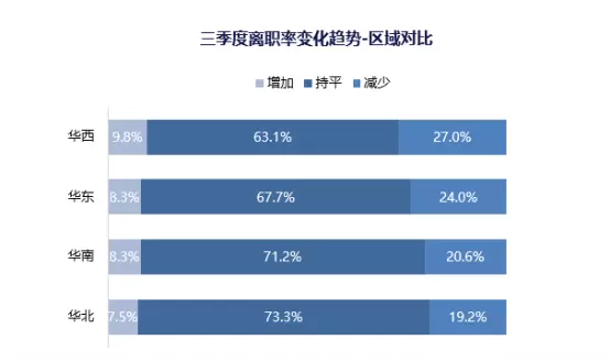 华西地区第三季度人员流动性相比第二季度有所降低,离职率增加的企业下降3.7%,离职率减少的企业上升3.0%。