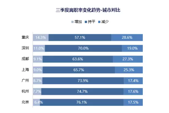 七大城市中除重庆外,第三季度离职率增加的企业占比均低于第二季度。重庆第三季度离职率增加的企业占比最高,达14.29%,比二季度提升0.8%。值得一提的是,重庆第三季度离职率减少的企业占比达到28.6%,是七大城市中离职率减少的企业占比最高的城市。