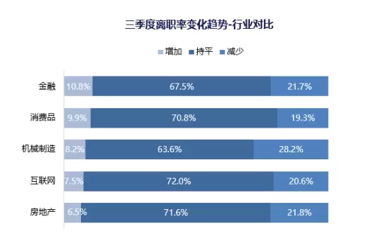 报告显示,五大行业中第三季度离率增加的企业占比均低于第二季度。房地产行业第三季度人员较为稳定,离职率增加的企业占比最少,且相比第二季度下降最多,达到7.6%;此外,金融行业离职率增加的企业占比较多,达到10.8%,相比二季度下降0.3%。
