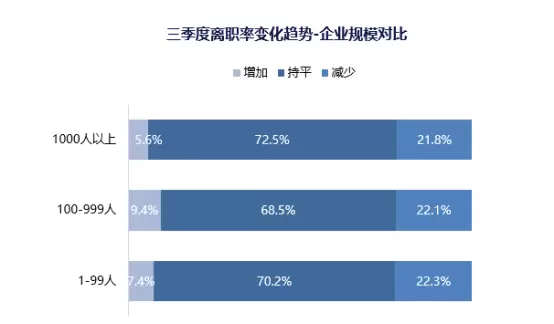 不同规模企业第三季度离职率变化方面,大型企业第三季度离职率增加的企业占比为6.6%,相比二季度下降7.7%,说明大公司的人员对市场保持观望态度,HR从大公司挖人的难度将变高。