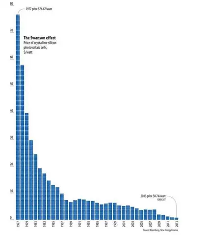 与此同时,太阳能看起来像一个有吸引力的选择。几十年来,太阳能发电价格一直在下降,从1977年的76.67美元/瓦到2004年的几美元/瓦。