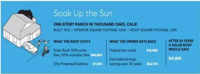在加利福尼亚州有一栋一层的牧场住宅,据估计,Solar Roof的客户在三十年内将节省41,800美元。这并不考虑州和地方税收抵免以及其他类型的补贴和激励措施,或者安装太阳能屋顶可能增加财产价值。