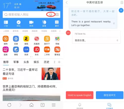 比如,在球场上跟留学生一起杀完球,想邀约人家去吃饭,但在头脑里搜索了半天单词也不知道该怎么表达,这时候搜狗手机浏览器就可以帮你解围。打开搜狗手机浏览器,点击搜索栏右上方的“话筒”图标,然后对着手机说出你想翻译的话,搜狗手机浏览器便迅速翻译成英语,点一下声音图标还能播放出来给对方听,跨语言沟通就是这么简单。