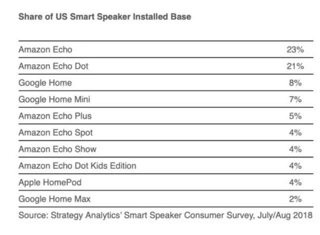 谷歌和亚马逊垄断美国智能音箱市场 苹果份额仅有4%