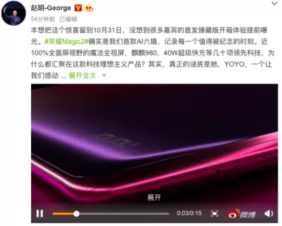 赵丽颖同款荣耀Magic2预约开启 全球首款AI六摄手机将至