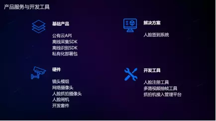 在技术成熟度和稳定性方面,百度人脸技术可支持百万级人脸库,对于高流量大并发的情况有很好的支持,人脸识别API可以实现毫秒级响应。百度还为开发者提供了丰富的产品服务与开发工具,包括基础产品、解决方案、硬件、开发工具4类服务,可以满足离线、在线多种复杂网络环境的诉求,企业可根据自身的需求灵活接入。此外,还提供整体的人脸识别开发套件,包含算法、行业主板、显示屏以及专业摄像头,可一站式轻松解决人脸识别开发。