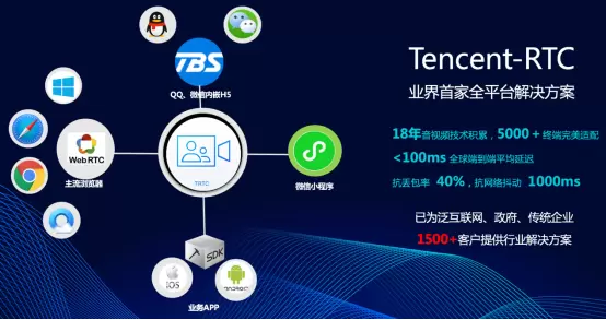 在融合音视频通信领域,腾讯云实时音视频产品方案TRTC,打通了适配webrtc的主流浏览器,以及基于腾讯TBS浏览服务的QQ、微信H5页面、APP客户端以及微信小程序等多种平台终端,为企业提供高品质、可定制、多平台互通的实时视频通话服务。是业界首家覆盖完整终端的全平台解决方案。
