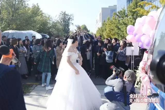 今天一大早,Apollo 无人车就组成了一支特别的迎亲队伍,还装饰成了婚车的样子,引来了很多路人的目光。