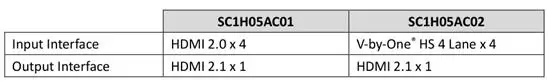 “SC1H05AC系列”是公司接口桥接芯片系列之一,搭载有HDMI 2.1 Tx,可支持8K视频传输。其中,SC1H05AC01支持HDMI2.0输入,而SC1H05AC02则支持V-by-One®输入。目前8K设备播放时需要4根HDMI2.0数据线连接,设备安装和搬运时会受到很大程度的限制,而搭载SC1H05AC的播放设备只需一根数据线连接。