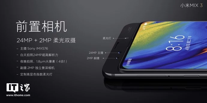 小米MIX 3前置2400万+200万像素双摄像头,具备了较高的解析度,并配备了柔光灯。其中,2400万像素主摄像头采用了索尼IMX576传感器,200万像素副摄像头为独立景深相机。