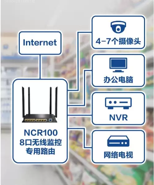 磊科监控专用路由器NCR100专为小商铺、多层住房监控组网场景量身定制,采用1WAN+8LAN接口设计,自带无线WiFi模块,并在无线部分配备了4根7dBi高增益天线,智能路由加智能交换机的一体式组网设计,可全面满足小型监控组网环境下3-7个高清数字摄像头、网络硬盘录像机、有线收银办公设备以及无线上网设备同时接入,无须额外再搭配交换机使用。同时,NCR100针对小型监控组网环境特点进行了深层优化,为监控工程商与用户提供更便捷的组网方式与更稳定的使用体验。