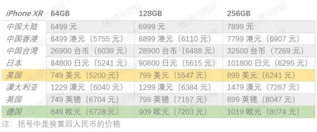 从这个表中不难看出,在美国和日版都未含消费税的前提下,美国依然是目前iPhone XR售价最便宜的国家,而欧元区依旧是最贵的地区,德国XR换算人民币之后的价格要比大陆行货更贵。