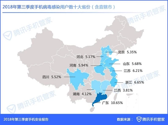 (图:2018年第三季度手机病毒感染用户数量TOP10省份报曝光,广东居首位)