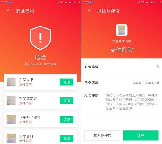 此外,木马病毒善于通过伪装来提升隐蔽性,用户稍有不慎就会中招。譬如,木马病毒伪装成各类应用APP,诱导安装后自动隐藏图标,让用户难以察觉风险。9月初正值中小学生开学季,不法分子假冒“校方”名义,诱导家长下载“升学文书”、“升学资料”等软件,趁机窃取用户短信验证码等信息。对此,腾讯手机管家精准查杀了多款“升学”相关恶意软件,保障了家长的手机安全和财产安全。