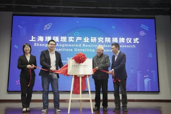 中国测绘科学研究院名誉院长、中国工程院院士刘先林,上海市经济和信息化委员会技术进步处负责人张宏韬,上海市浦东新区科技和经济委员会副主任徐敏栩,视+AR创始人兼CEO张小军共同为增强现实产业研究院揭牌。