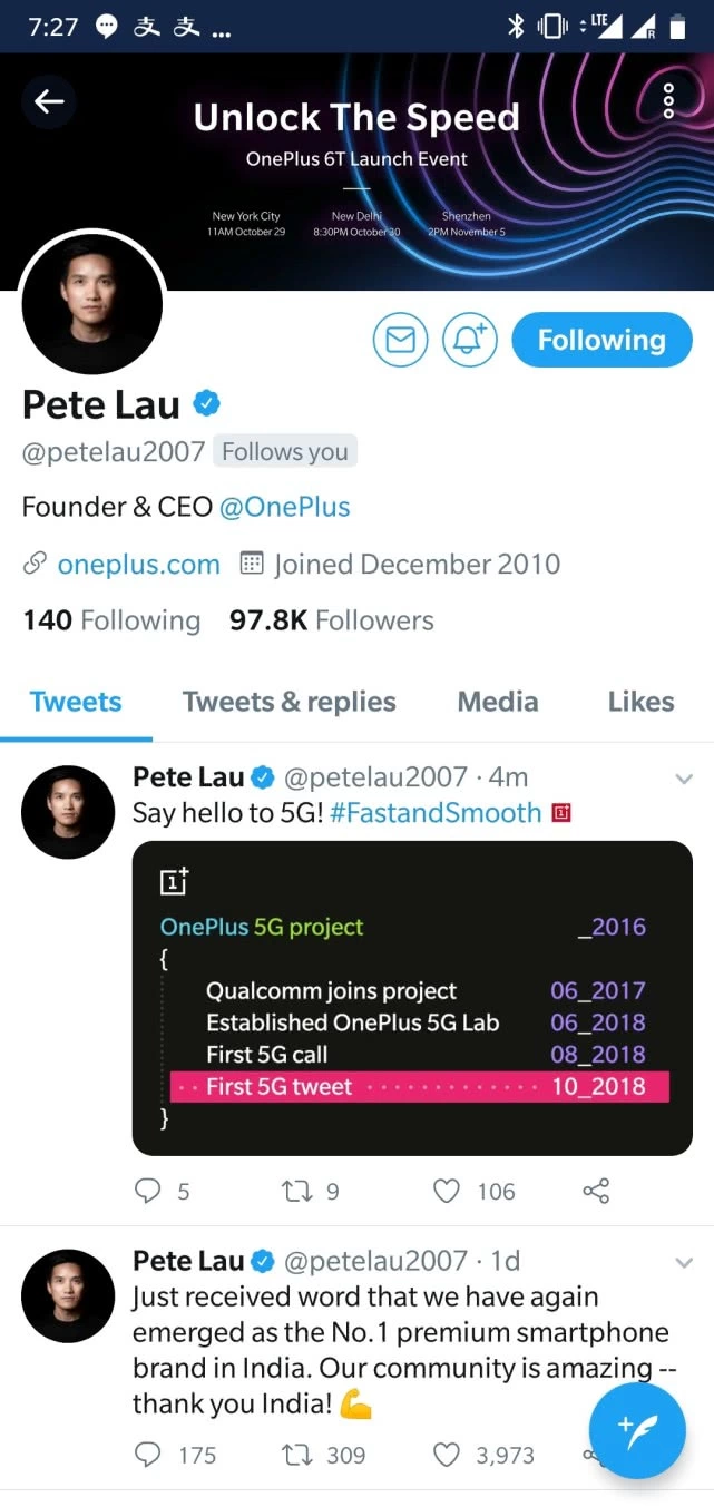这条推特显示出一加手机成为成功使用5G网络手机品牌之一。2016年,一加成立了5G项目,开始不断在5G上投入。2017年6月,来自高通的研发团队正式参与进一加的5G项目,双方就5G设备前端器件和架构展开了联合研究。