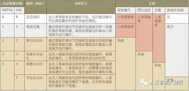 这是“AI+自动驾驶”应用场景首次大规模呈现到国人眼前,可以想象的是,自动驾驶如果得到大规模应用,将极大颠覆我们目前的交通出行方式。不过,技术的进步和场景的应用是一个循序渐进的过程,目前大部分自动驾驶技术还是试验中。国际汽车工程师学会(SAE)于2014年发布了自动驾驶的六级分类体系,将自动驾驶技术分为0级、1级、2级、3级、4级、5级,共六个级别,具体级别划分和描述如下: