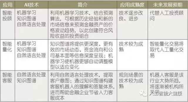 人工智能在金融领域的发展仍然具有很大前景。目前,人工智能在金融行业比较成熟的应用主要有智能投顾、智能量化交易与智能客服,主要采用的方法有机器学习、自然语言处理、知识图谱和计算机视觉等。