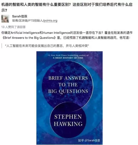 而PTS的创始人「Sarah佳辰」则更倾向于两者之间的趋同,她引用了霍金在遗作《Brief Answers to the Big Questions》中的观点:「人工智能在未来可能会发展出自己的意志,并与人类相冲突」,并且,她还分享了自己在未来对孩子的教育观点。