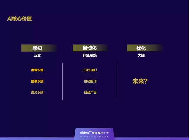 第一就是感知,人可以感受到视频传达的感情,这是文化领域非常重要的价值,用内容调动人内心的情感共鸣产生价值,所以人工智能第一个技术就是感知,让电脑知道人看了会产生什么样的感情,让电脑看懂电影和电视剧,这是第一步的感知,现在大部分的人工智能公司产品的基础都是感知。