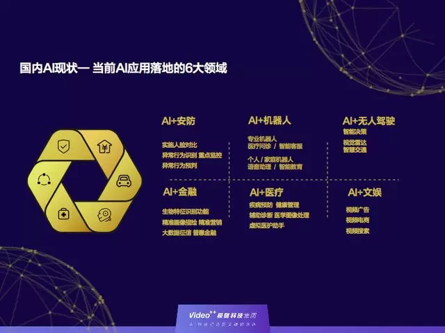 从AI角度看在哪些方面能产生价值?安防、教育、金融、无人驾驶,在AI应用落地的六个领域里,AI+文娱的公司都在盈利,因为文娱本身还有很多价值未被挖掘,潜力巨大。文娱基本上是以线上为主,所以它不像医疗受限于很多利益格局,它就很容易利用互联网的规模化快速变现,所以我们认为这个行业在短期、中长期都非常有价值的。我们在AI原有内容批量商业化方面是做得最好的,Video++将公司定位在AI+文娱的科技企业,利用AI技术将视频进行结构化处理之后赋能产业,AI场景营销平台现在已经非常成熟了;第二是文娱电商,今年刚开始做,很多视频网站现在可以边看视频边购物,这背后有我们的力量;第三我们开始用AI的力量创造新的IP出来,也会线上线下结合用「AI+文娱」带动「衣食住行」产业的迭代升级,完成产业全生态覆盖上的深度打造。