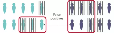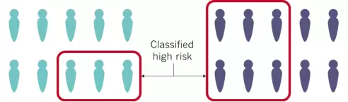 在蓝色组中,1/7的人被误认为是高风险的;紫色组中,1/2的人被误认为是高风险的。所以紫色组看起来更像是“假阳性的”——被误认为是高风险的。