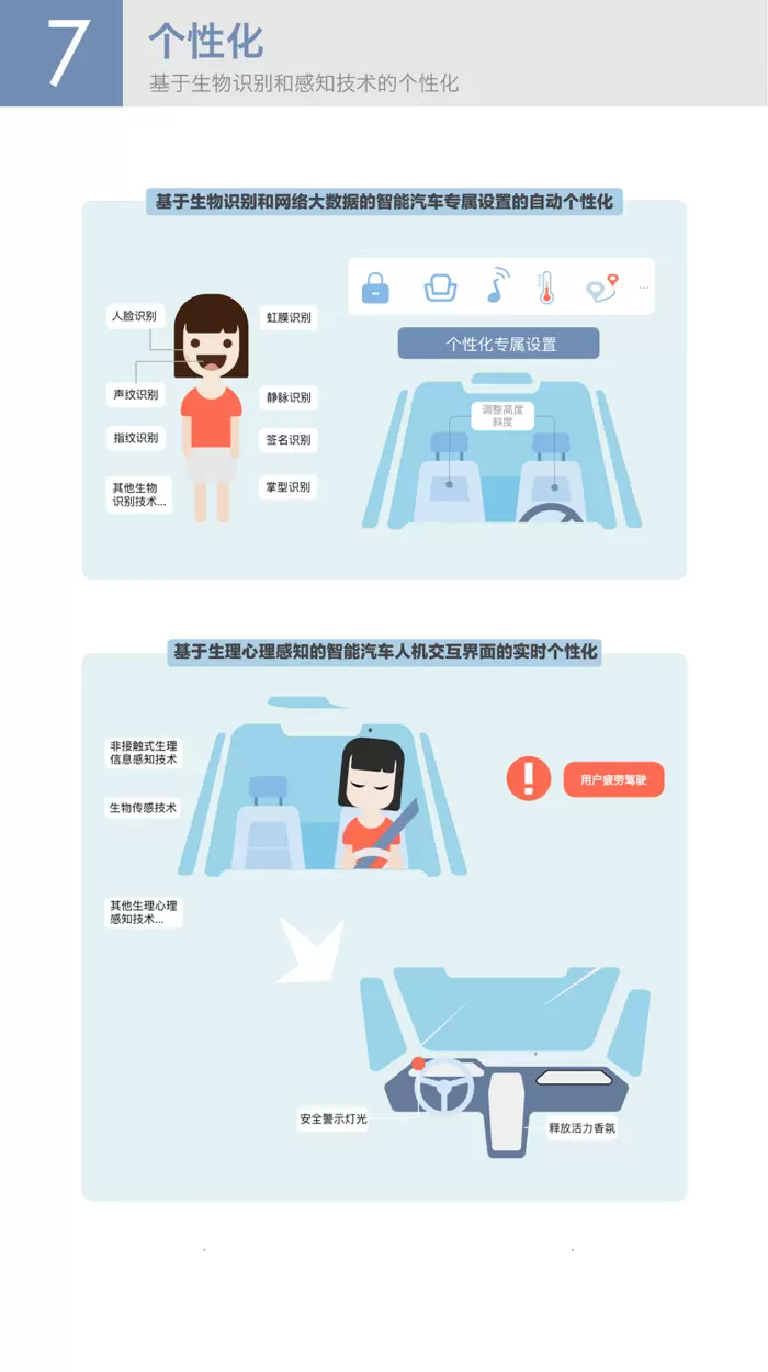 个性化是汽车用户长期以来也是未来的重大需求。生物识别与感知技术的发展赋予汽车智能个性化感知的能力。因此,《白皮书》认为在生物识别的基础上,线上数据和线下生物识别的整合,将是个性化汽车最为核心的趋势。在个人身份识别的基础上,结合生理心理感知技术,可以实现智能汽车对人的生理心理状态的实时监控,从而实现智能汽车人机交互界面的实时个性化。生物数据作为个性化服务的基本依据,在给用户带来智能便捷服务的同时,也伴随着巨大风险,所以在未来的智能汽车个性化设计中如何在机制上更好地保护隐私,同时将这种机制以合适的方式传递给用户将是一个非常重要的设计和研究课题。