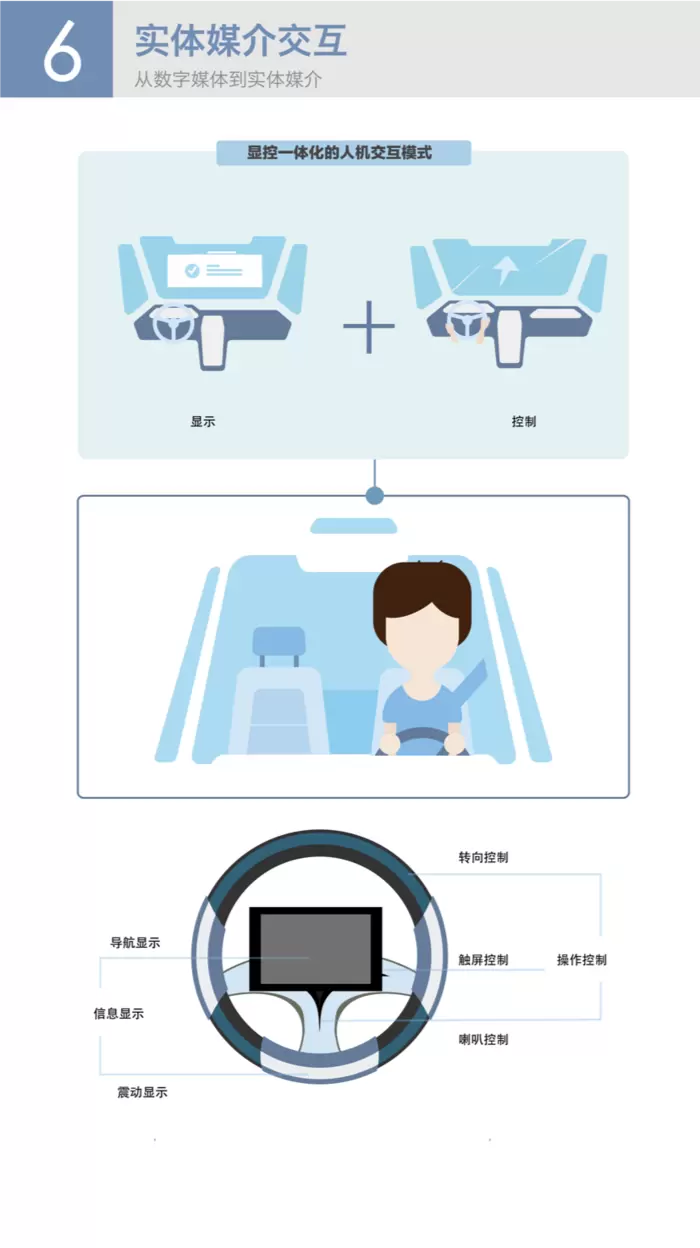 随着显示技术的发展,特别是在前面提及的无处不在的显示趋势的影响下,各类智能产品逐步向着显示控制一体化的方向发展,汽车人机交互界面的复杂化促使新交互模式的出现。因此,《白皮书》认为在未来智能汽车应用中,车内实体设备都有可能成为交互媒介,并被赋予全新的交互功能。在媒介材料上,其材质、柔韧度、弯曲度等性能实现了多样化实体,通过控制交互传感器的线性度、灵敏度、重复性等条件构建新交互形式。全自动驾驶场景下会产生新实体媒介控制方式,传统的控制设备可能隐藏或消失,被其他方式替代,突破传统控制设备形式,形成新实体交互媒介,实体交互媒介的设计不仅是对实体界面的设计,同时包含对虚拟信息的设计。