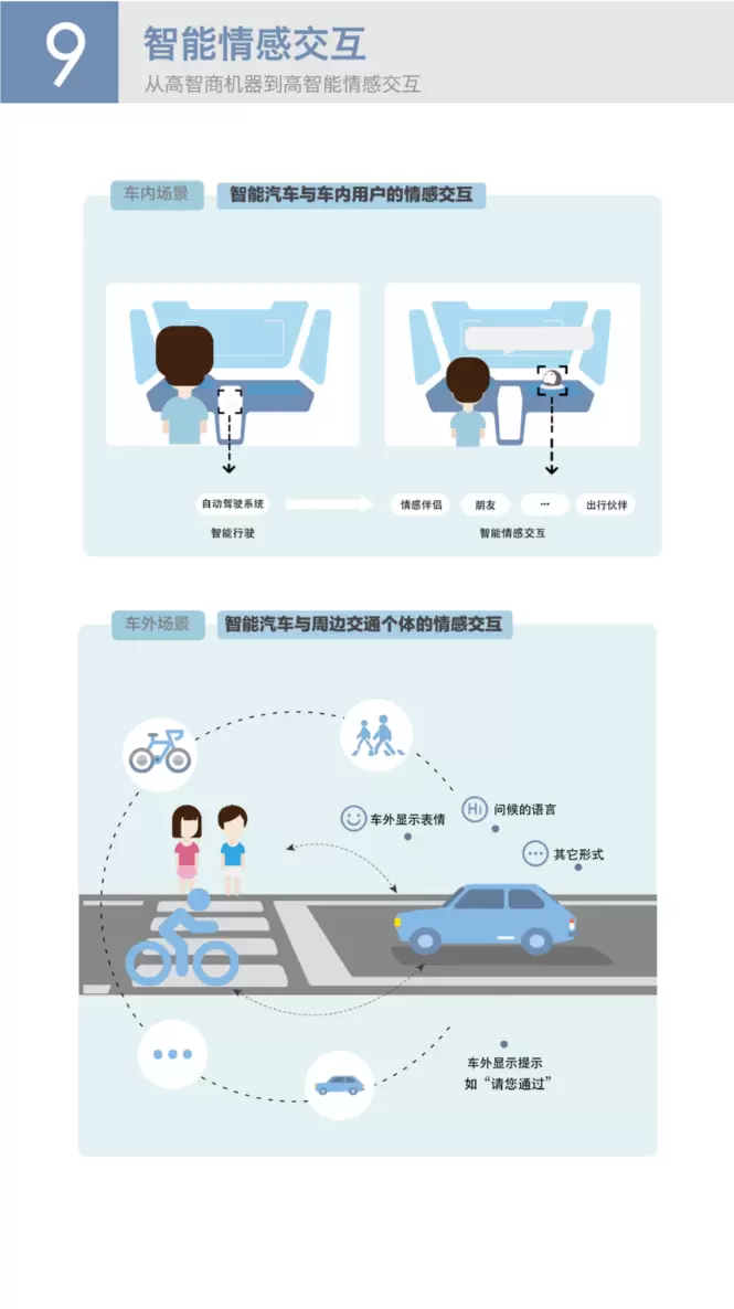随着人工智能技术的发展,人们要求它们在越来越多的方面能够补偿、加强和替代人的感知功能、思维功能和行为功能,这就必然要求这些产品具备更强的情感识别、情感理解和情感表达能力。因此《白皮书》认为未来的智能汽车在能够“理解和思考”的基础上,实现智能情感交互成为汽车人机交互设计的重要趋势。智能汽车作为一个智能体,不仅仅会和车内的用户产生交互,还会和车外的周边交通个体产生交互,例如车外的行人、其它智能汽车、交通基础设施等,所以智能汽车与周边交通个体的情感交互将会成为未来汽车人机交互的主要内容。