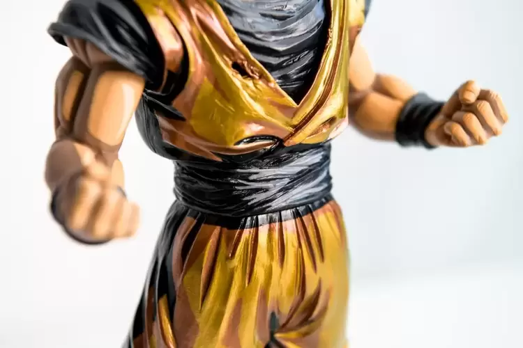 该手办以黄金弗利萨的的金色作为主色,并设计为特有的漫画感图绘风格,衣服褶皱都是有加入漫画感的阴影效果,手指关节纹路、衣角裤腿破损处等细节处理都十分逼真,充分还原悟空与佛利萨最后对决时情节。手办设计前后经历十余组设计比稿,在基于悟空经典造型上,通过多次与日本IP方在外观细节和颜色沟通设计的沟通才确定下来,保证经典同时带来全新的收藏观感。
