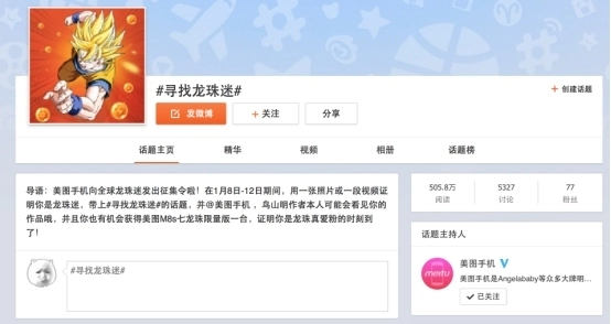 今年年初,美图手机在微博发起了#寻找龙珠迷#的活动,该话题阅读量短时间内就接近500万,就是这样一个简单的活动,几乎一夜之间来自全球的七龙珠的真爱粉们全部冒出来了,可谓使出了浑身解数来“争夺”美图手机M8s七龙珠限量版。