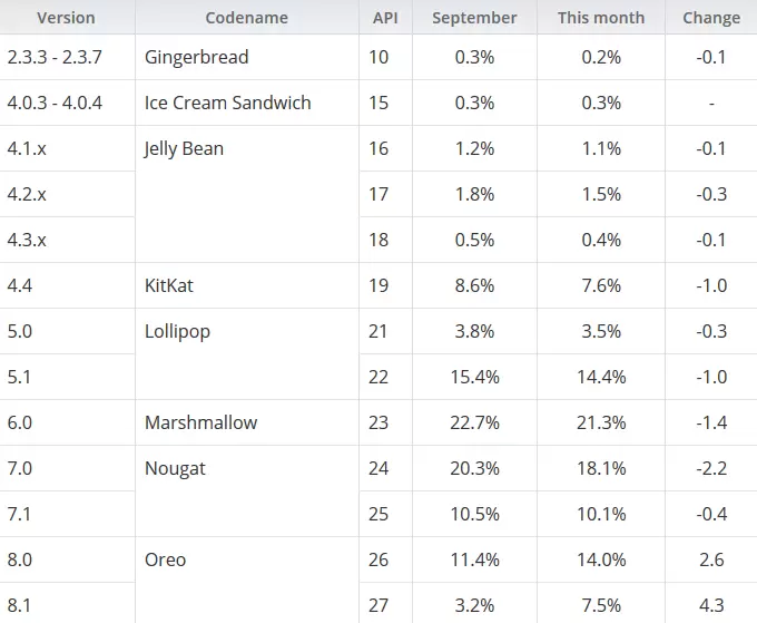 谷歌发布10月份Android版本适配率报告:Nogat下滑至28.1% Oreo升至22.5%