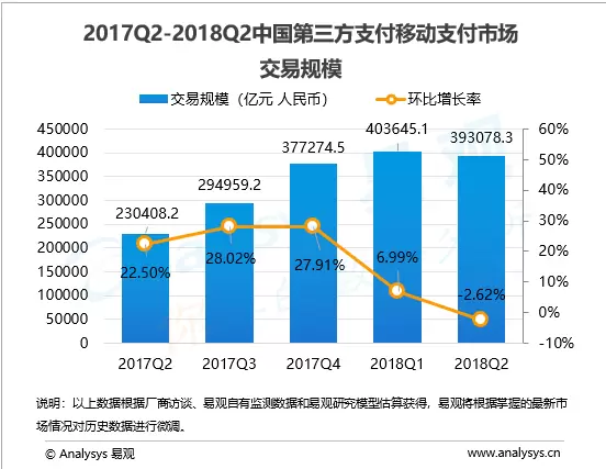 根据易观分析,移动支付行业交易规模在2018年第二季度环比增速出现负增长。由于金融类交易受到监管严控等原因,规模出现较大幅度降低,同时整体交易量级已经达到较高规模,移动支付对小额高频场景渗透已经达到较高水平,区域下沉并未出现突破性进展,在场景固化等因素的影响下,行业整体规模首次出现环比降低的现象。