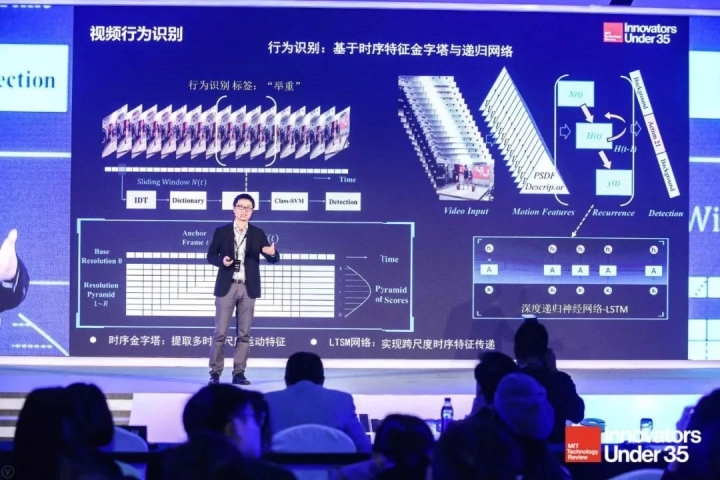 首先是行为识别。行为识别无非是给你一段视频,你告诉观众里面的人在做什么,里面发生了什么。我们在这做了一些创新,比如针对时序的问题,我们提出了时序金字塔算法。这个算法是对时间轴进行分尺度建模,使不同尺度的特征都能很好的表达。我们又配合流行的深度学习里的 LSTM 深度递归网络,使得不同尺度的信息在不同时间进行流动,最后达到很好的识别效果。