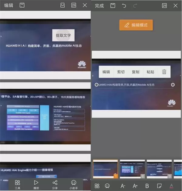 最近华为在上海发布会上发布了Mate 20系列,展示了一项与金山办公软件合作的人工智能办公成果。在发布会、课堂等场景中,观众常常习惯用手机拍摄下PPT画面,针对这一需求,金山办公软件WPS Office移动版推出了AI创建PPT功能,可准确识别出照片中的文字与图像内容,自动配适移动端组成演示文档文件(PPT),并且图片转化成的PPT还可以对其文字部分进行编辑。也就是说,手机中拍下的PPT再也不会沉睡在相册中,而是直接成为更便于编辑、观看和分享的文档。
