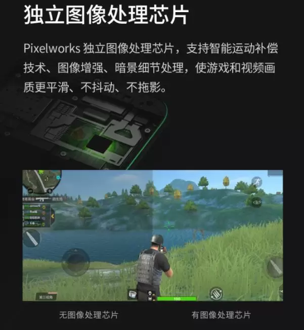 此次黑鲨游戏手机有别于传统手机,除了顶级 CPU 外,黑鲨游戏手机还专门为游戏增加了一块独立图像芯片,打个比方独立图像芯片就好比电脑用的显卡,它能够辅助 CPU 增强图形渲染能力,最大的应用就是在高分辨率视频编辑上以及游戏画面进行渲染,提升观感。