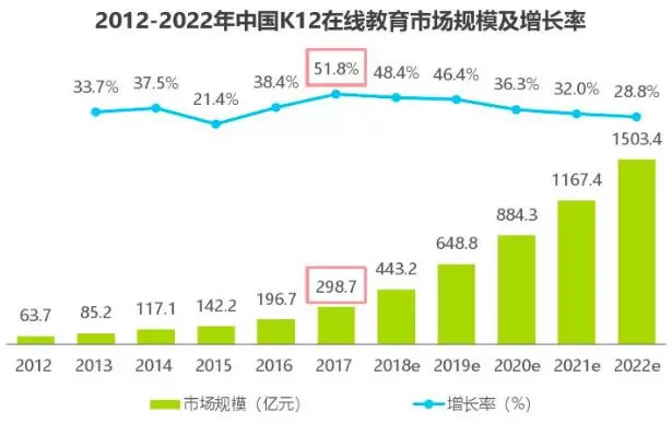 据艾瑞咨询调查数据显示,自2012年以来,中国K12线上教育市场增长速度基本保持在30%以上(2015年为21.4%),在2017年增长率甚至高达51.8%,相应市场规模达到298.7亿元。因而,2017年也被认为是线上教育规模化变现元年。