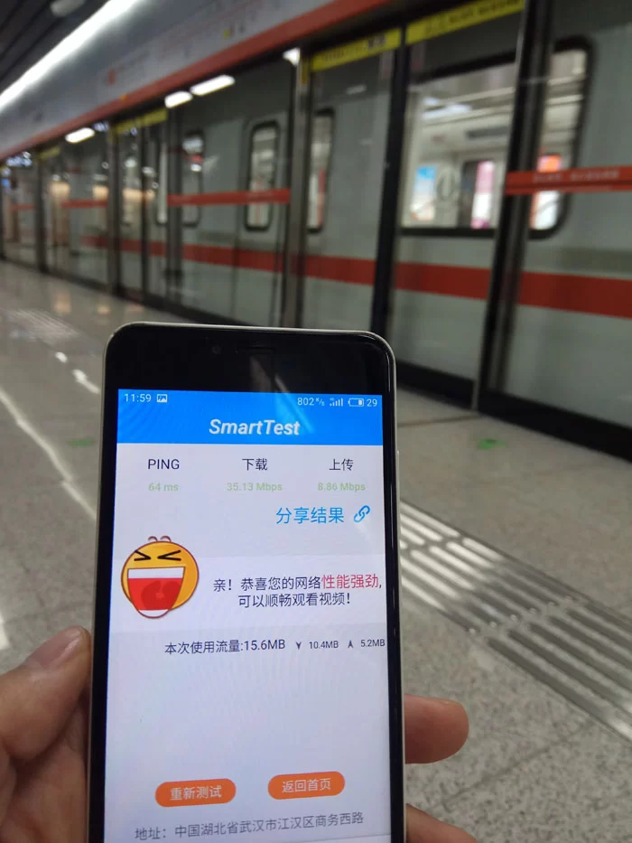 目前,湖北地铁站台站厅及车厢4G综合覆盖率为99.9 %,下载速率40Mbps,峰值速率可以达到80Mbps,VoLTE语音呼叫全程成功率99.8%。