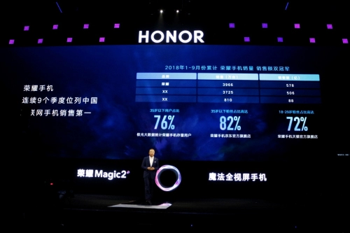旭日大数据的上半年全球手机市场报告显示,二季度荣耀手机全球出货量同比增长超过63%,是全球增长最快的智能手机品牌,荣耀手机的全球市场份额也因此从2017年一季度的3.9%增长至6.2%。在国内市场上,二季度荣耀手机出货量同比增长超50%,是中国智能手机市场增速最快的手机品牌。另据赛诺数据最新发布的报告,2018年1-9月中国智能手机市场容量同比下降7.7%。不过即使市场形势不佳,荣耀手机第三季度的销量依然同比增长了19%,以12.7%的市场份额排名第四。前9个月,荣耀手机更是以3966万台的总销量、578亿元的总销售额,双双进入中国手机市场的前五名,同时也是唯一入围前五的互联网手机品牌。同时,尤其需要提到的是荣耀总裁赵明在发布会上援引的一组最新机构数据,截止今年第三季度,在国内市场,连续9个季度位列中国互联网手机销售第一,进一步夯实互联网手机第一品牌的地位。