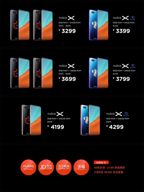 当然,如此超乎想象的努比亚X拥有蓝金版、海光蓝、黑金版、深空灰四款颜色版本,其中6GB+64GB配置的黑金与深空灰配色售价仅3299元、海光蓝护眼版售价仅3399元;8GB+128GB配置中,黑金及深空灰配色售价仅3699元、海光蓝护眼版售价仅3799元;顶级8GB+256GB配置中黑金版与蓝金护眼版的售价则分别为4199元与4299元。努比亚X将于10月31日17点在努比亚官方商城,努比亚全国线下体验店,京东官方旗舰店,天猫官方旗舰店以及苏宁易购官方旗舰店全面开启预约,并于11月5日上午10点在全平台正式开售。