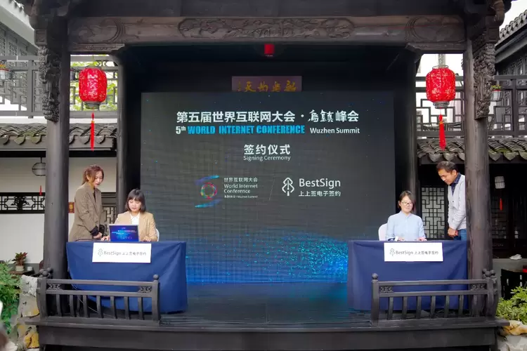在前几天举办的第五届世界互联网大会签约仪式上,上上签电子签约也以卓越的表现赢得大会组委会青睐,从数百名企业中脱颖而出,成为第五届世界互联网大会高级合作伙伴以及合作伙伴集体签约仪式现场独家签约技术服务商,代表中国电子签约登上全球顶级舞台。