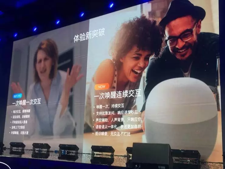高亮在现场演示了新款音箱。在大会会场这样高噪音的环境下,说话的距离超过1米,音箱的唤醒和识别表现很好。一次唤醒就能多次对话,智能音箱在说话时,也能聆听用户的新命令并且快速执行。从更多的演示deme来看,其也能实现一定的上下文理解。