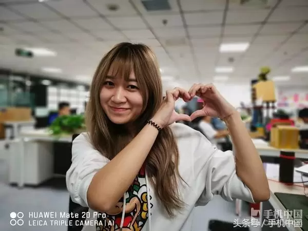 接下来我们来挑战下极限,用一个“笔芯”手势来测试,华为Mate 20 Pro能够准确地分辨出两手之间的那一块小小部分。结果大家都看到了,即使是如此刁钻的测试,华为Mate 20 Pro依旧通过强大的AI算法,实现了虚化效果,让人心悦诚服。
