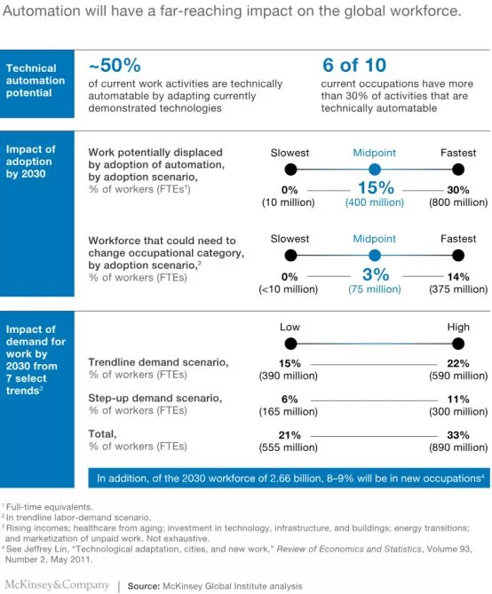 首先是失业问题。2016年至2030年的中点应用场景(midpoint adoption scenario)表明,约有15%的全球劳动力(4亿工人)可以通过自动化取代。
