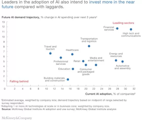 许多公司和部门在人工智能的采用方面是落后的。因此需要制定具有明确利益的人工智能战略,寻找具有适当技能的人才,克服限制端到端部署的功能孤岛(functional silos),以及领导者缺乏对AI的所有权和承诺,这也是最常被引用的障碍。