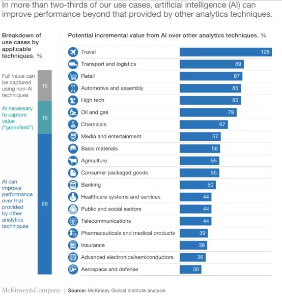 研究人员对19个行业和9个业务功能中的400多个用例进行了分析,发现AI在69%的潜在用例中改进了传统分析技术,还有16%的人工智能用例中找到了AI的“greenfield”(绿灯区)解决方案,可以解决其他分析方法无效的情况。研究预计基于人工神经网络的深度学习技术到2030年可以提供所有分析技术总潜在价值的40%。此外,研究人员预估深度学习技术每年可以实现高达6万亿美元的价值。