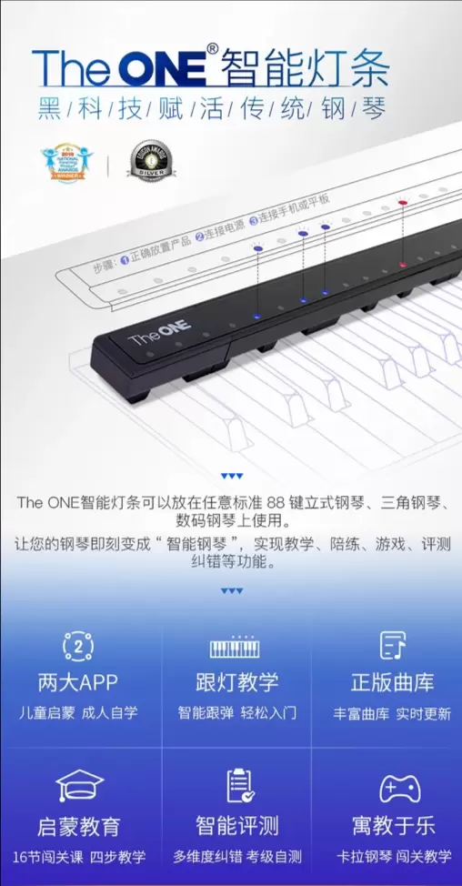 The ONE智能灯条是The ONE在“AI+音乐教育”领域取得的最新成果。作为业内首家真正实现人工智能音乐教学的硬件,它适用于任意标准88键立式钢琴、三角钢琴、数码钢琴。该产品能将传统钢琴和智能APP(TheONE智能钢琴APP和智能钢琴课APP)连接,使传统钢琴即刻变成“智能钢琴”,实现APP教学、陪练、游戏、AI精准测评、智能纠错、考级预测等强大功能。The ONE智能灯条还支持跟灯教学,以此智能跟弹,轻松入门。
