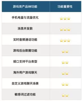 因此企业在游戏中开始加入各种丰富有趣的IM即时通讯功能。通过IM即时通讯能力,一方面可以有效增强不同的游戏用户之间的沟通交流,增强游戏本身的趣味性;另一方面可以增加用户对游戏产品的使用粘性,促进用户使用产品的活跃度。具体到单项的IM功能,游戏类产品会更加注重以下八项功能痛点,这其中环信即时通讯云优势明显。