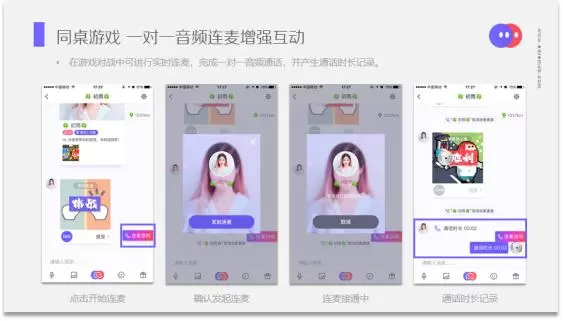 除了传统的富媒体消息实时聊天,同桌游戏加重了实时音频通话场景的应用。在用户进行一对一游戏匹配成功后,进入聊天窗口,不仅可以发送文字、语音、图片、表情等消息,还可以点击连麦按钮,发起音频请求,游戏伙伴通过请求后即可建立音频聊天,在游戏的同时进行社交,极大满足了其年轻目标使用人群的娱乐需求。