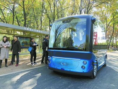 整个公园里最引人注目的当属百度阿波龙小巴车。这款车是由百度、金龙客车、英特尔合作生产的全国首辆商用级无人驾驶微循环电动车,也是全球首款L4级量产自动驾驶巴士,充一次电可行驶100多公里。